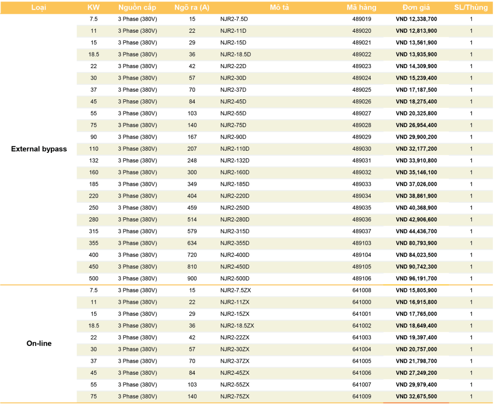 - Lưu ý: đối với các loại tải nặng, chọ công suất khởi động mềm lớn hơn một cấp so với công suất động cơ.
