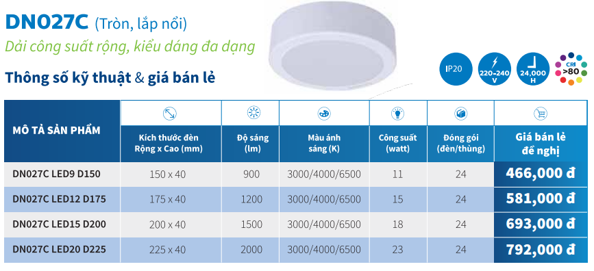 - Sản phẩm có thời gian chiếu sáng đạt được lên đến 20000 giờ