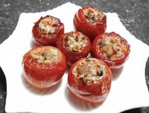 • Cà chua chọn quả nhỏ, tròn cắt đôi, nạo sạch ruột. Dùng thìa nhồi thịt vào cà Nhớ miết thịt xuống cạnh cà chua cho thịt bám chặt.